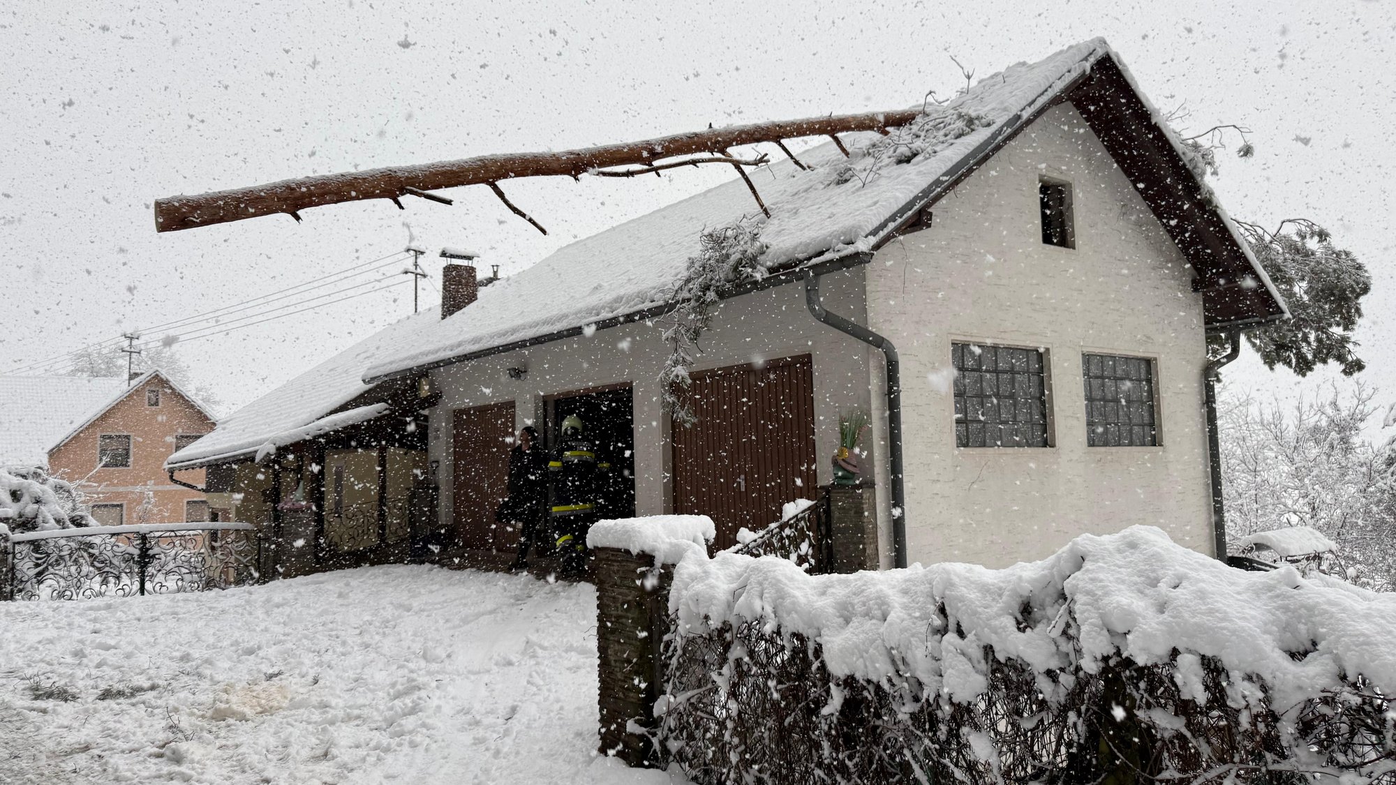Kurz darauf wurde die Feuerwehr zu einem weiteren Einsatz alarmiert. Ein durch die Schneelast geschwächter Baum stürzte um und fiel auf das Dach einer Garage.
