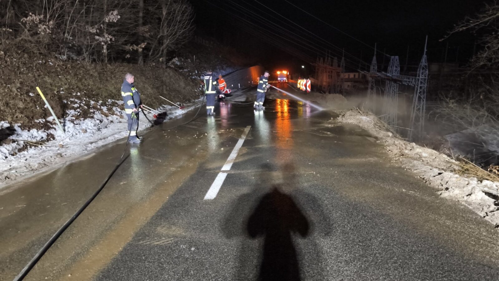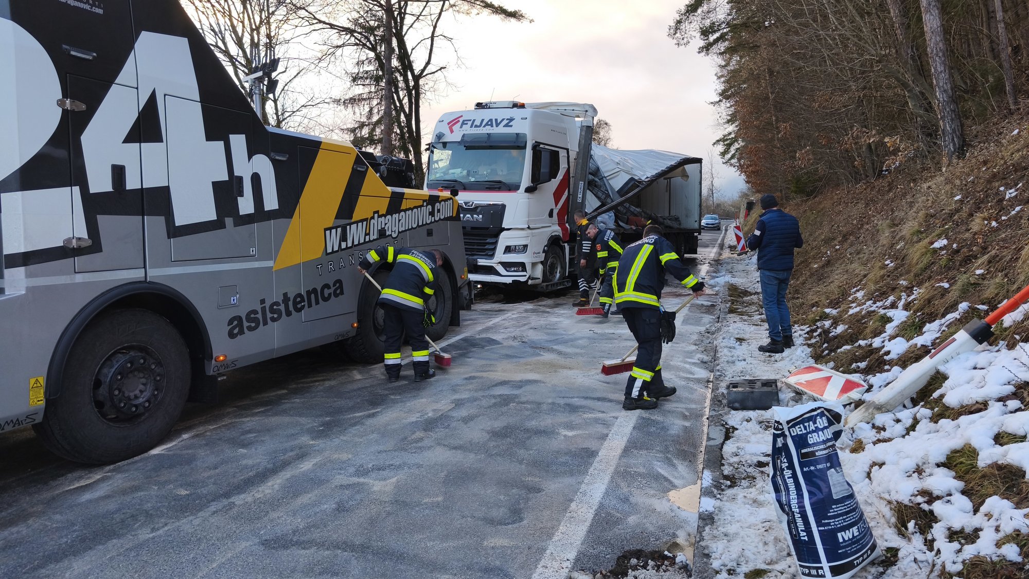 Unsere Aufgabe bestand darin, die Mitarbeiter der Straßenmeisterei sowie ein privates Abschleppunternehmen bei den Bergungsarbeiten zu unterstützen. Während der Arbeiten mussten ausgelaufene Betriebsmittel gebunden werden, um eine Gefährdung für Umwelt und Verkehrsteilnehmer zu verhindern.